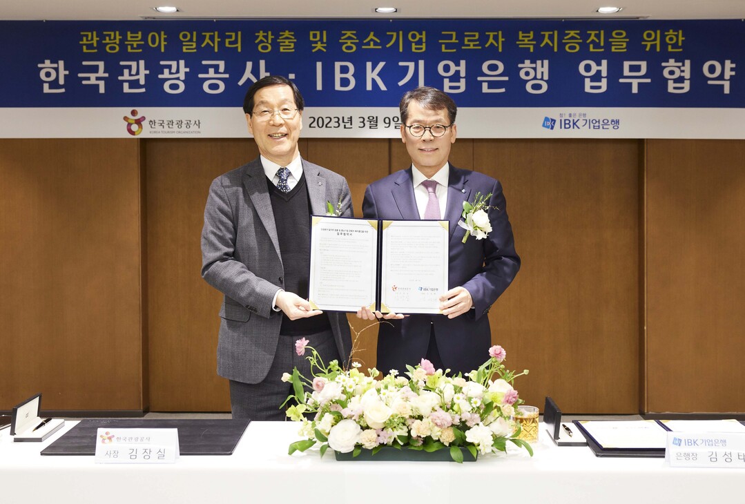 [하비엔뉴스 = 송현섭 기자] IBK기업은행은 본점 대회의실에서 한국관광공사와 ‘중소기업 근로자 복지지원 및 관광산업 일자리 창출을 위한 업무협약’을 체결했다고 9일 밝혔다.