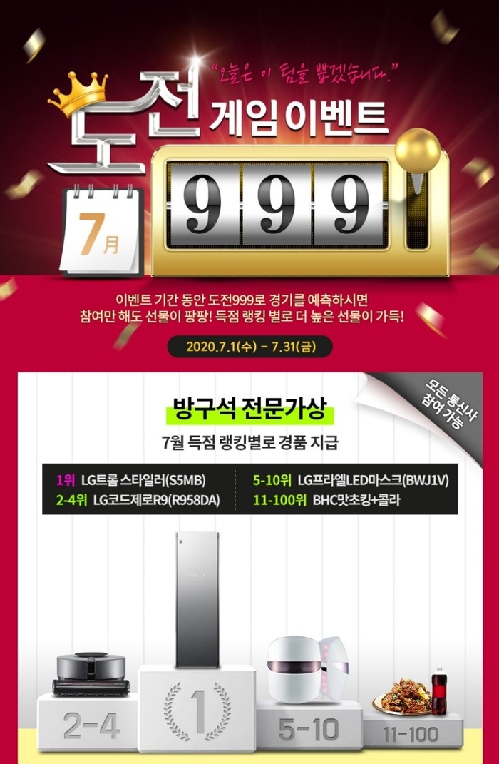 경기가 있는 날 3개 팀을 선택하면 각각 100·10·1의 자리 슬롯에 순서대로 배치되고, 실제 경기득점 1의 자리 숫자 3개가 모여 세 자리 숫자가 완성된다. 숫자가 높은 순서대로 LG 트롬 스타일러(1명), LG 코드제로R9(3명), LG프라엘 LED 마스크(6명), BHC 치킨 교환권(90명)을 제공하며, 당첨자 발표는 8월 10일이다.
