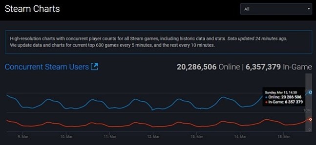 코로나19 바이러스가 아시아를 넘어 북미와 유럽 전역으로 번지면서 외부 여가활동을 자제하고 집에서 게임을 플레이하는 유저들이 늘어남에 따라 스팀 동시접속자 수도 급속도로 증가했다는 것.