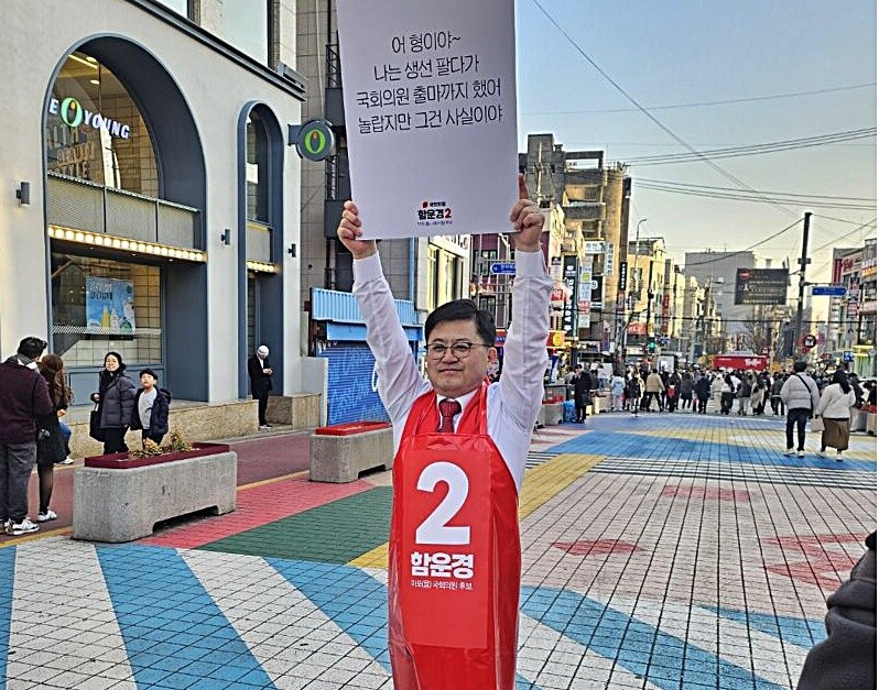 존경하는 국민 여러분, 사랑하는 마포의 동료 시민 여러분. 서울대 물리학과 나온 생선 장수 함운경이 미래로 가는 대한민국의 발목을 잡고 늘어지는 운동권 특권 정치를 청산하기 위해 출마했습니다. 자신들이 배출한 정치인 때문에 부끄러워하는 마포 시민의 자존심을 살리기 위해 출마했습니다.