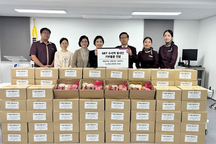 이날 수서역 직원 봉사단은 가을 수확철을 맞아 지역사회와 제철과일을 나누기 위해 수서동 주민센터를 방문해 사과와 배 등으로 구성된 선물세트 150개를 전달했다.