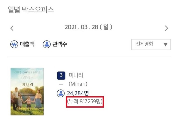 3월 3일 이후 3주 연속 박스오피스 1위를 차지하며 2021년 최고의 화제작다운 면모를 과시했던 <미나리>는 이번 80만 관객 돌파로 100만 관객까지 이어지는 흥행가도를 흔들림 없이 달릴 것으로 기대를 모은다.