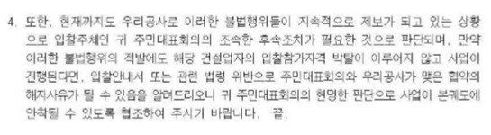 SH에서 김 사장 명의로 주민대표회의에 발송한 공문을 보면 ‘대우건설의 입찰 참가 자격을 박탈하지 않을 경우 주민대표회의와 맺은 협약을 해지, 공공재개발 사업지에서 제외시키겠다’는 내용이 담겨 있다.