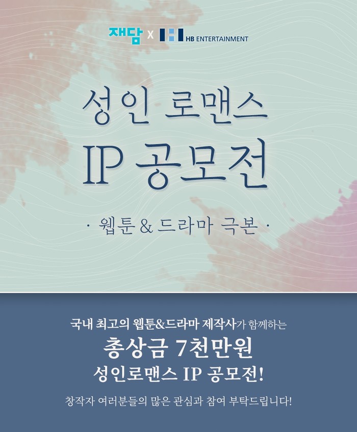 [하비엔=노이슬 기자] 드라마 제작사 HB엔터테인먼트가 웹툰 기획사 재담과 함께 '성인로맨스 IP 공모전'을 주최한다.