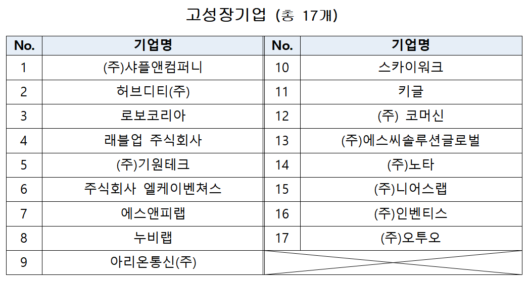 | ‘SW 고성장클럽’ 사업에 신규로 참여하게 된 고성장 소프트웨어 기업 17개사. [자료=과학기술정보통신부] |