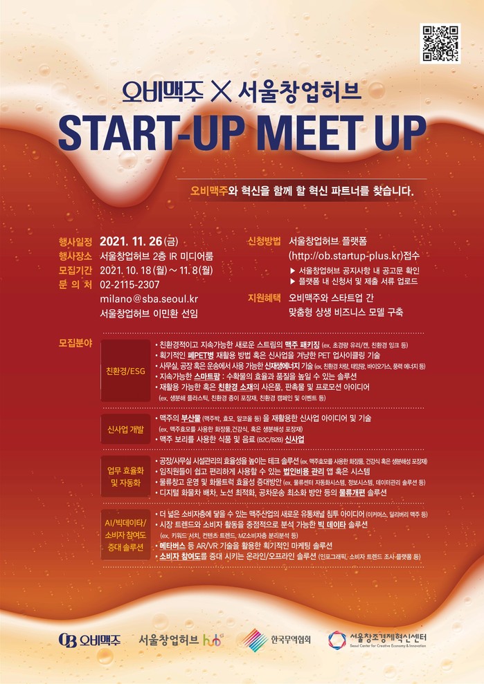모집 기간은 오는 11월 8일까지로 참여를 원하는 스타트업은 서울창업허브 홈페이지를 통해서 접수 가능하며, 최종선발은 오비맥주 내부 평가를 통해 12월 초에 개별로 통보 될 예정이다.