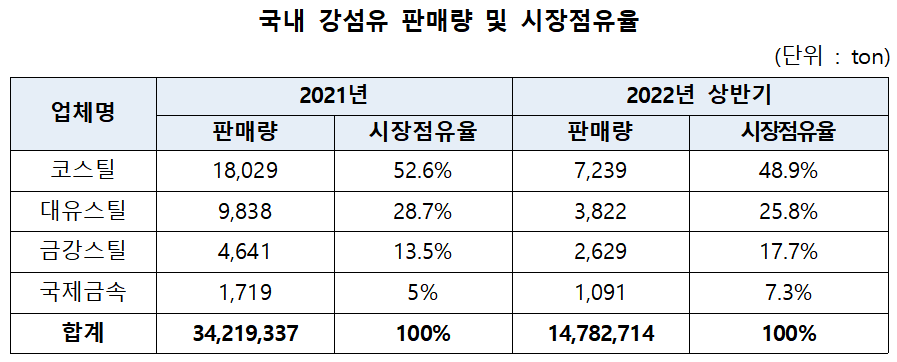 | 국내 강섬유 판매량 및 시장점유율. [자료=공정거래위원회] |