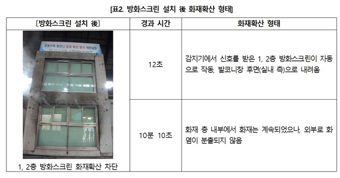 실험 결과 방화스크린을 설치하지 않았을 때 화재 발생 후 3분 만에 2층으로 확산돼 3분 30초경에 2층의 발코니 유리창이 깨졌다. 반면, 방화스크린을 설치한 경우, 화재 발생 12초 만에 화재감지기로부터 신호를 받은 1, 2층 방화스크린이 동시에 작동해 발코니창 실내 측으로 스크린이 내려왔다.
