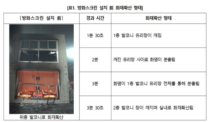 방화스크린 설치 전 3분 만에 2층 확산…설치 후 대피시간 확보