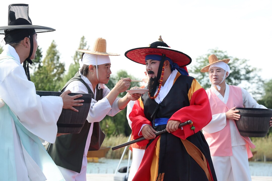 수변무대에 도착한 뒤에는 마포나루의 입항 장면을 재현한 ‘입항재현’ 행사가 펼쳐졌다. 새우젓 상선을 맞이하던 옛 풍습을 되살려 박강수 마포구청장의 “통(通)이요!”를 외치는 새우젓 감별과 개장선언, 대북타고(3회) 세리머니가 이어졌다.