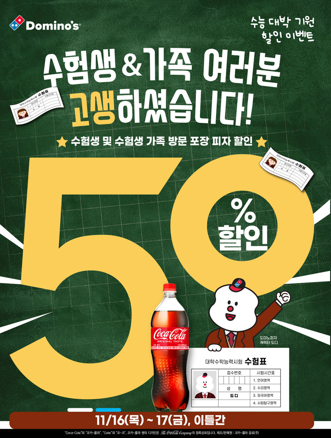 이번 할인 이벤트는 수험생과 그 가족을 위해 마련된 것으로, 16일에는 피자 3종(블랙타이거 슈림프, 치즈 크레이프 샌드, 포테이토 피자)과 콜라 1.25ℓ를, 17일에는 피자 3종에 겨울 신제품을 포함한 피자 4종에 콜라 1.25ℓ를 주문하면 각각 50%의 할인 혜택을 받을 수 있다.