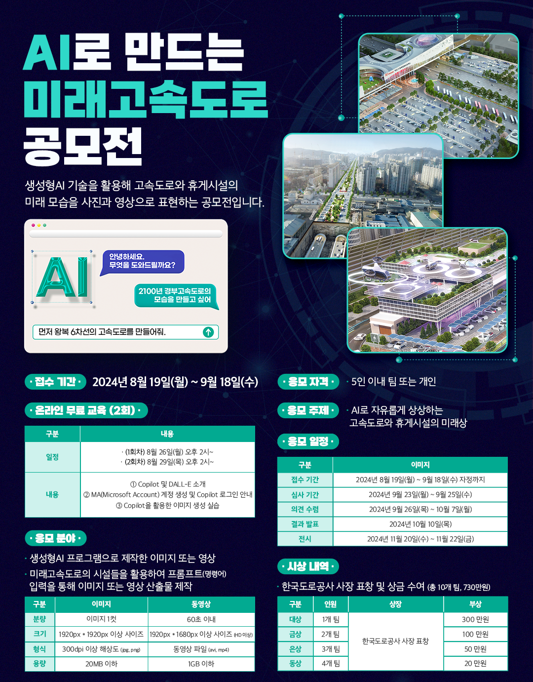 19일 도로공사에 다르면, 이번 공모전은 생성형AI 프로그램을 활용해 이미지 또는 영상을 제작해 참여할 수 있으며 미래 고속도로에 대한 창의적 아이디어를 발굴하고 4차 산업 인재 양성을 돕기 위해 마련됐다.
