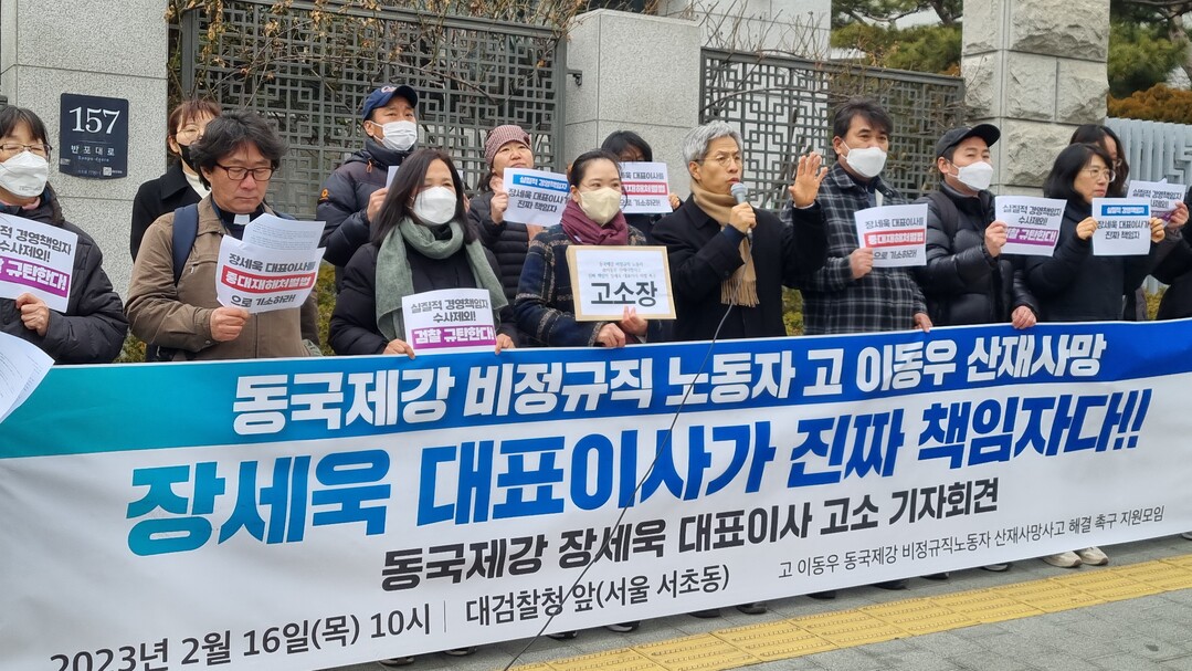 이후 1년 가까이 수사가 진척되지 않자 이날 오전 70여 노동시민사회단체로 구성된 ‘이동우 동국제강 비정규직노동자 산재사망사고 해결촉구 지원모임’(이하 지원모임)이 대검찰청 앞에서 기자회견을 열고 동국제강의 실질적인 경영책임자인 장세욱 대표이사를 입건하고 수사해야 한다고 촉구했다.