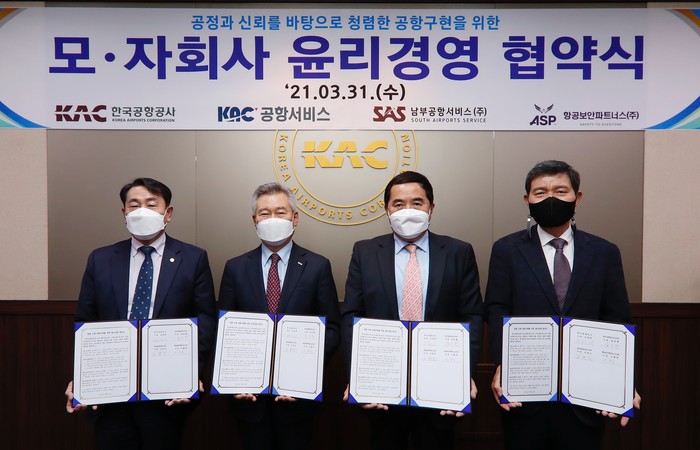 [하비엔=문기환 기자] 한국공항공사는 31일 서울시 강서구 본사에서 KAC공항서비스(주), 남부공항서비스(주), 항공보안파트너스(주) 3개 자회사와 청렴·신뢰공항 구현을 위한 <모·자회사 윤리경영 협약>을 체결했다.
