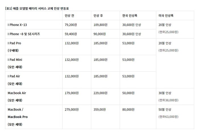 반면 미국에서는 배터리 교체 서비스 비용이 아이폰과 아이패드는 각각 20달러(2만5000원), 맥북에어는 30달러(3만8000원), 맥북프로는 50달러(6만3000원)가 인상될 예정이다.
