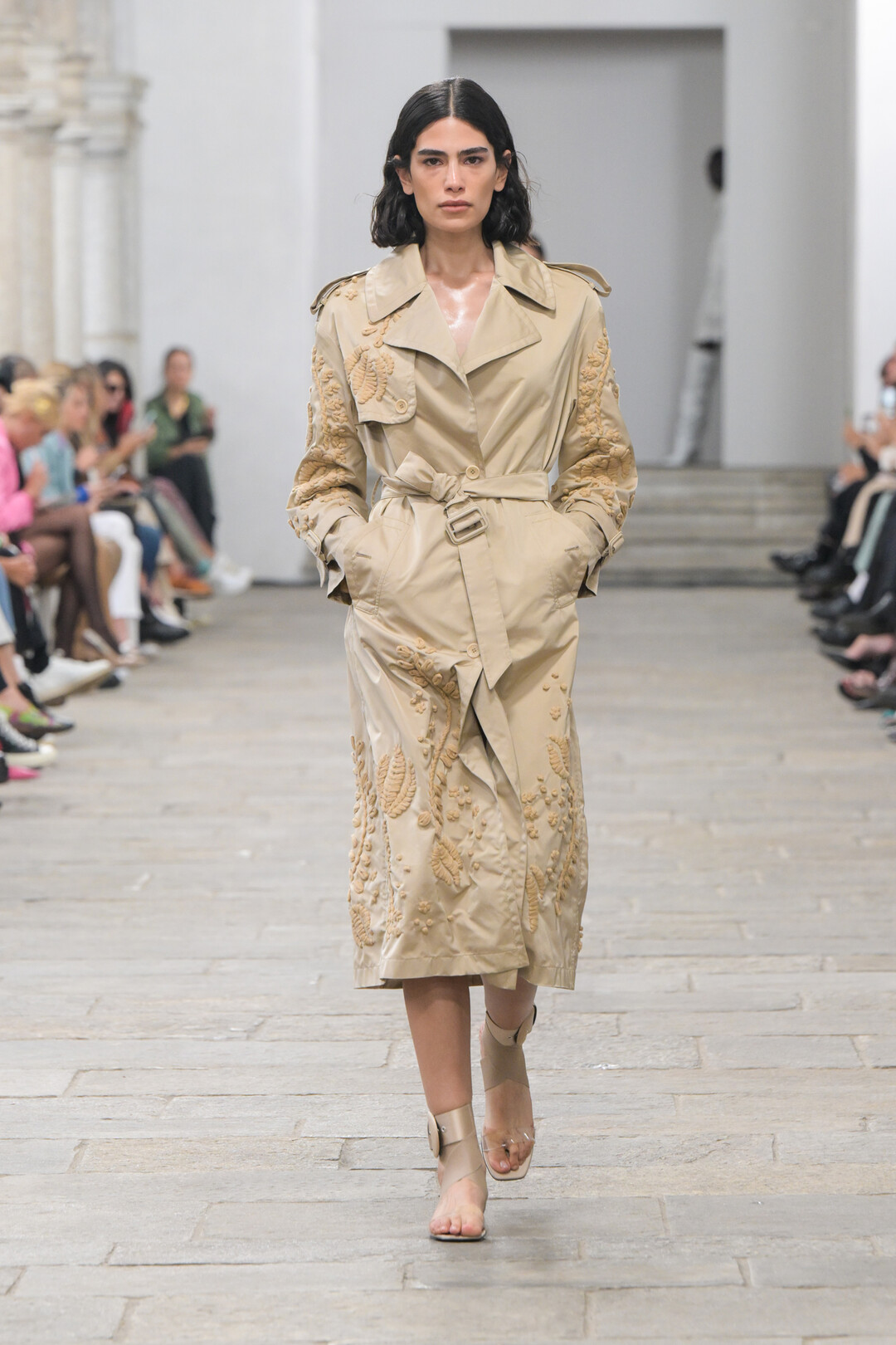 에르마노 설비노는 엠브로이더리 트렌치 코트를 선보인다.