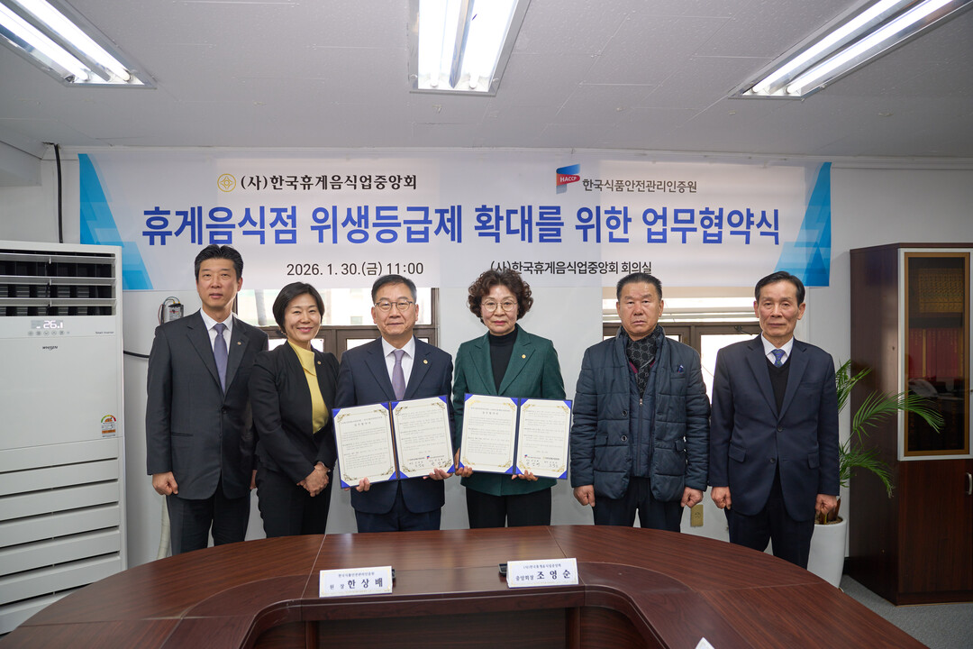 [HBN뉴스 = 김혜연 기자] 한국식품안전관리인증원과 사단법인 한국휴게음식업중앙회가 30일 휴게음식점의 위생관리 수준을 높이고 식품안심업소(위생등급 지정업소) 확대를 위한 업무협약(MOU)을 체결했다.
