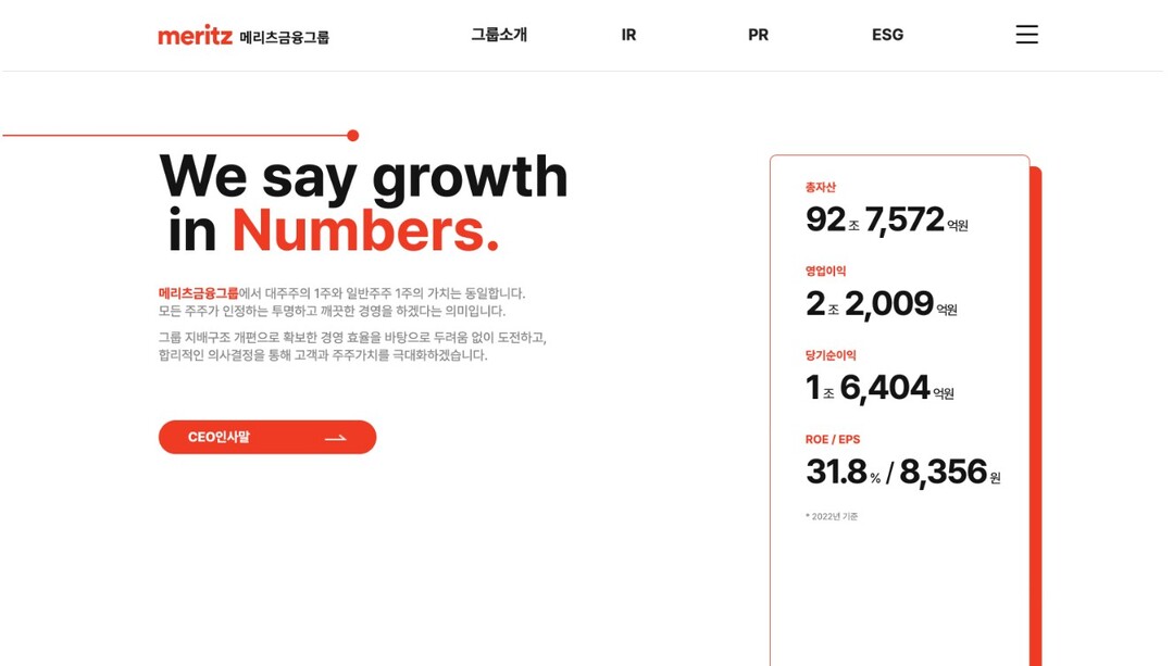 한편 메리츠금융그룹은 원 메리츠로 통합된 단일 이미지를 확립하고 주주·고객과 소통을 위해 새롭게 개편한 홈페이지를 선보였다. 새 홈페이지는 메리츠그룹 CI(기업이미지) 색상인 오렌지 레드를 활용해 수치와 시각적 자료 등을 배치했다.