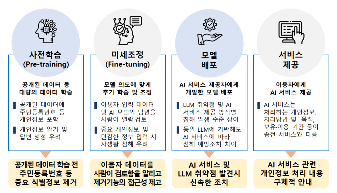 또 AI 서비스는 종전의 서비스와는 처리하는 개인정보의 항목, 처리 방법·목적, 보유 및 이용기간 등에 현격한 차이가 존재하고, LLM 복제 모델·오픈 소스 형태로 배포되는 경우 LLM에 취약점이 발견돼도 후속 조치가 즉시 개선되기 어려운 사례가 확인됐다.