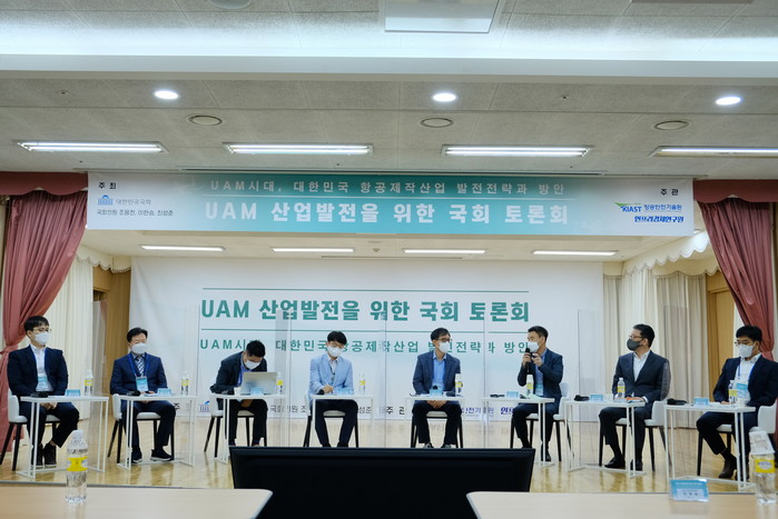 UAM 산업발전을 위한 국회 토론회는 23일 오전 9시 30분 여의도 이룸센터에서 항공안전기술원과 인프라경제연구원이 주관, 국회 국토교통위원회 소속 조응천(더불어민주당), 이헌승(국민의힘), 진성준(더불어민주당) 의원이 공동 주최해 'UAM시대, 대한민국 항공제작산업 발전전략과 방안'이라는 주제로 정부, 기업, 학교, 연구소 등 관계자 80여명이 참석한 가운데 개최됐다.