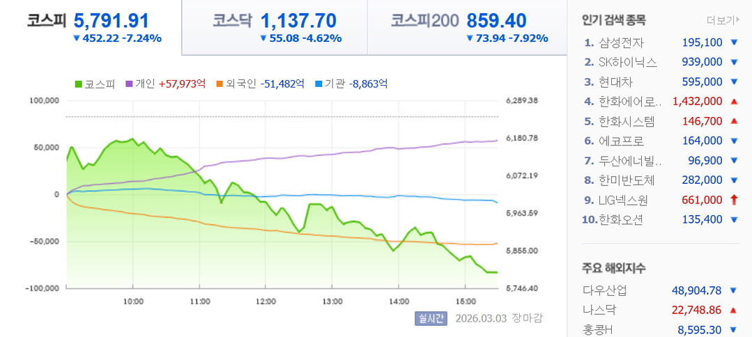 [HBN뉴스 = 이필선 기자] 미국과 이스라엘의 공격을 받은 이란 당국이 세계 에너지 수송의 관문인 호르무즈 해협 봉쇄 카드를 꺼내들면서 3일 코스피가 급락했다. 이로인해 '대장주'인 20만 삼성전자와 100만 SK하이닉스 주가가 10%넘게 폭락했다.
