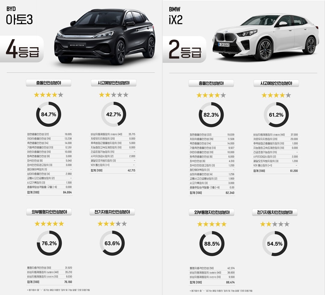 한국교통안전공단은 3일 BYD의 아토3와 BMW iX2 등 소형 스포츠유틸리티차(SUV) 부문 2개 차종 평가 결과를 발표했다.