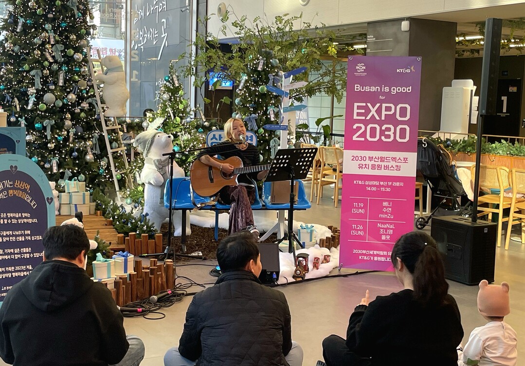 이를 위해 KT&G는 지난 19일 KT&G 상상마당 부산에서 세계박람회 유치를 기원하는 버스킹을 진행했다. 이날 행사에는 ‘minƵu(밍글)’ ‘수연’ 등 상상마당 부산이 배출한 총 6개 팀이 참가해 공연을 선보였고, 오는 26일에도 버스킹을 진행할 예정이다.