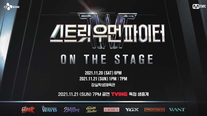티빙이 독점 생중계할 '스트릿 우먼 파이터 ON THE STAGE'는 오는 11월 21일 오후 7시 티빙에서 실시간 스트리밍으로 만나 볼 수 있다. 티빙 유료 가입자라면 누구나 시청 가능하다.