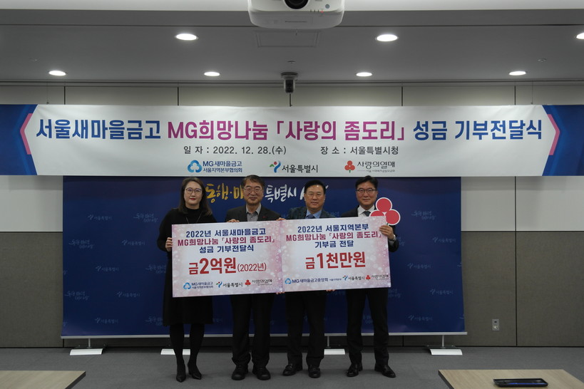 지난달 28일 서울시청에서 열린 전달식에는 성성식 새마을금고 서울지역본부협의회 부협의회장, 이주호 새마을금고중앙회 서울지역본부장, 김상한 서울시 복지정책실장, 최윤경 서울 사회복지공동모금회 부장 등이 참석했다.
