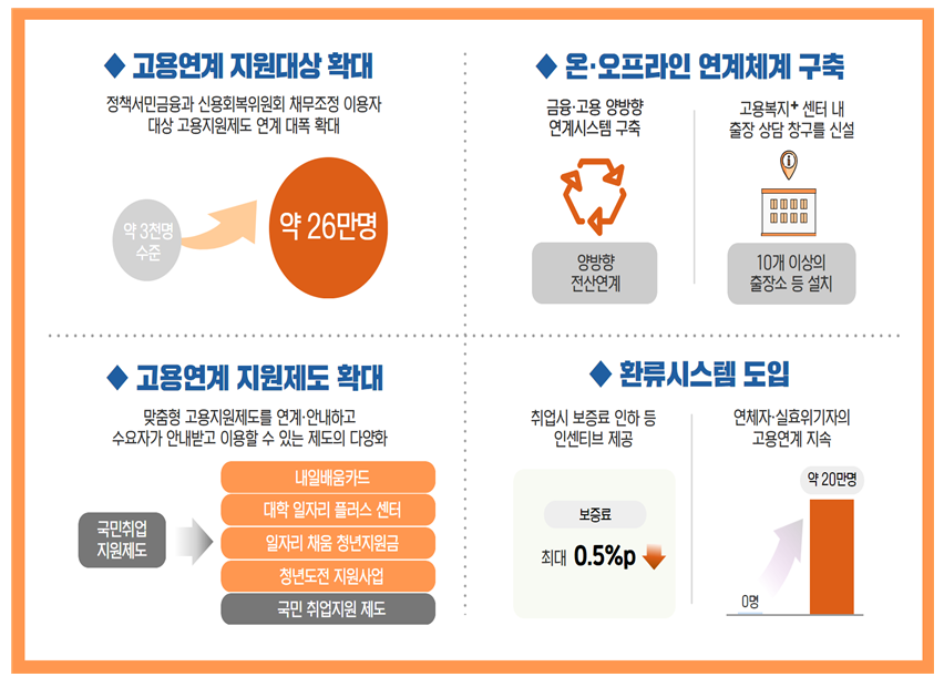 정책서민금융·채무조정 이용자의 상황에 따라 맞춤형 고용지원제도를 연계·안내하고, 연계의 효과를 제고하기 위한 제조도 정비된다.