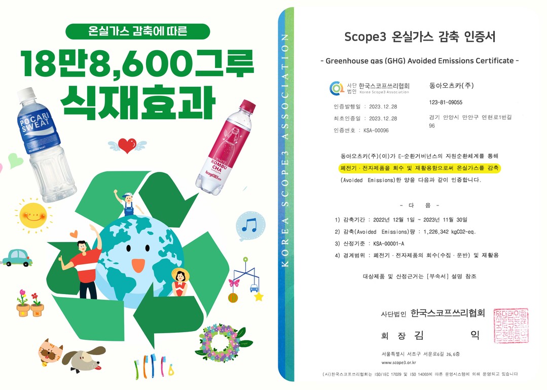 | 동아오츠카가 한국스코프쓰리협회로부터 ‘온실가스 감축’에 대해 인증받았다. [사진=동아오츠카] |