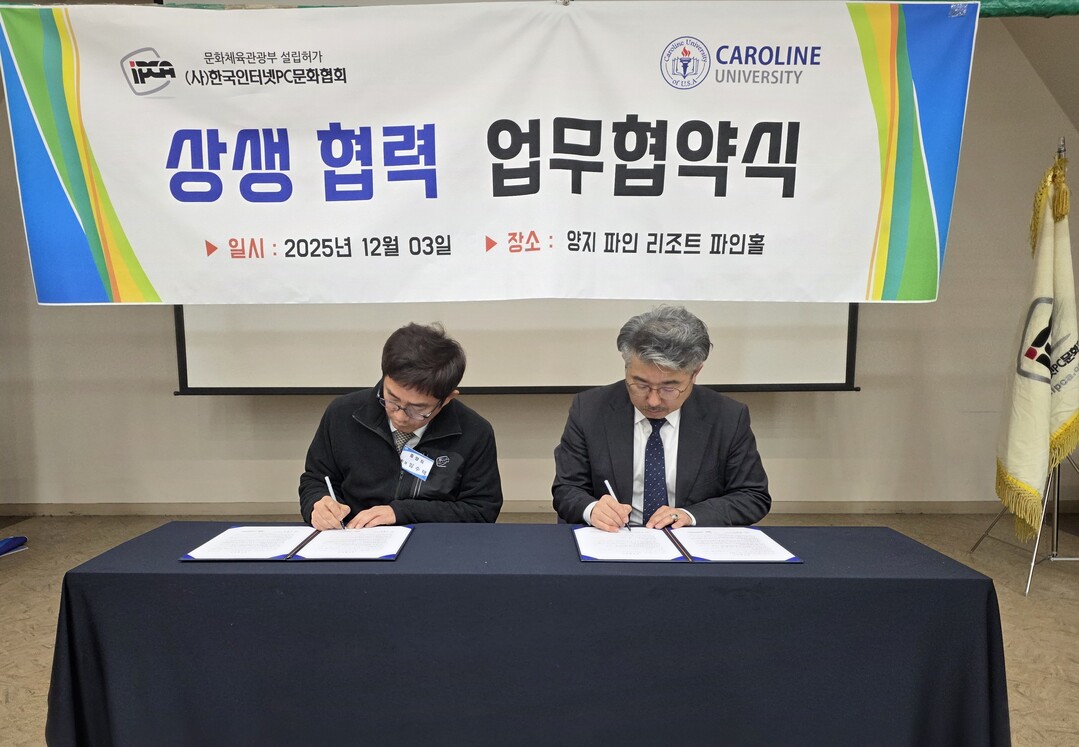 [HBN뉴스 = 이동훈 기자] 한국인터넷PC문화협회는 12월 3일, 미국 캘리포니아 주에 위치한 캐롤라인대학교(Caroline University)와 글로벌 ICT·e스포츠 인재 양성을 위한 전략적 업무협약(MOU)을 체결했다고 밝혔다.