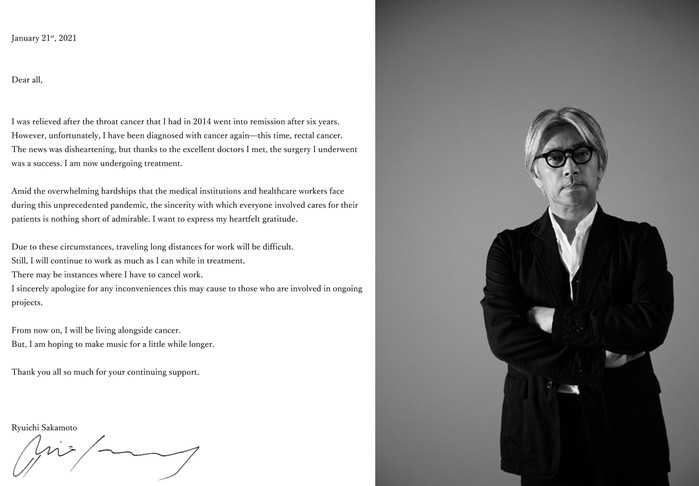 마지막으로 사카모토 류이치는 "이제부터 나는 암과 살 것"이라며 "하지만 나는 조금 더 오랫동안 음악을 만들고 싶다"고 바랐다.