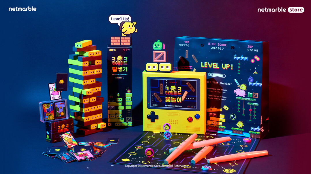 이번에 선보인 제품은 넷마블 대표 마스코트인 ‘ㅋㅋ(크크)’를 활용한 ▲ㅋㅋ아케이드 탑쌓기 ▲ㅋㅋ아케이드 윷놀이 세트 ▲ㅋㅋ아케이드 화투 ▲ㅋㅋ골드 용돈봉투로, 넷마블스토어 온·오프라인 매장에서 구매 가능하다.