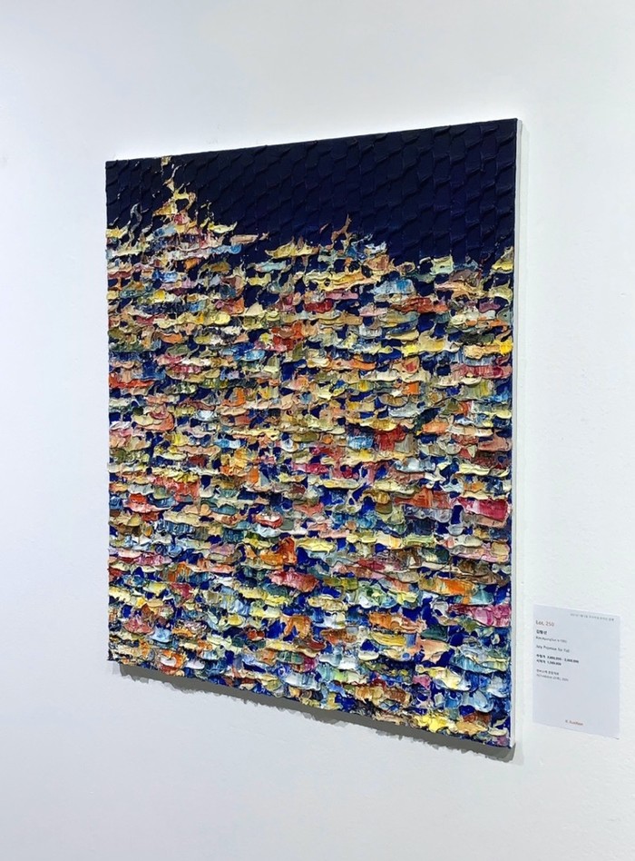 김 작가의 출품작 ‘July Promise for Fall’은 아크릴과 유화 등 다양한 보조제를 이용해 가늘거나 혹은 두텁게 조각하며 덧붙이고 쌓아 만들어 이번 경매 작품에 작가의 마음이 충분히 표현됐다.