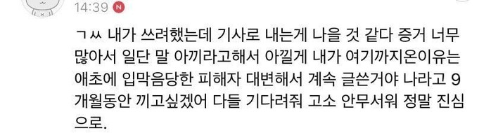 하지만 소속사 측 입장이 나온 후 A씨는 "내가 쓰려했는데 기사로 내는게 나을 것 같다. 증거 너무 많아서 일단 말 아끼라고해서 아낄게. 내가 여기까지 온 이유는 애초에 입막음당한 피해자 대변해서 계속 글쓴거야. 나라고 9개월동안 끼고싶겠어. 다들 기다려줘. 고소 안무서워. 정말 진심으로"라며 반박을 예고했다.