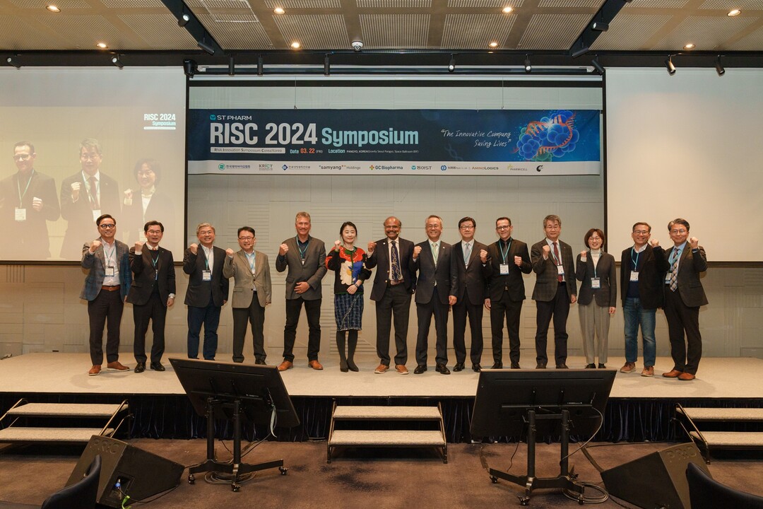 | 김경진 에스티팜 대표이사(사진 오른쪽에서 7번째)와 주요 연사들이 RISC 2024에서 기념사진을 촬영하고 있다. [사진=에스티팜] |