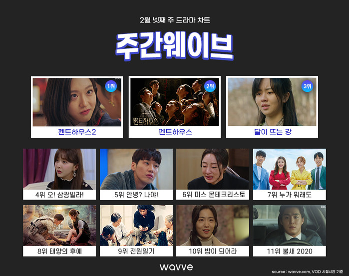 ‘펜트하우스2’의 인기는 웨이브에서도 고스란히 나타났다. ‘펜트하우스2’는 전주에 이어 2월 넷째 주 주간웨이브 드라마 국내 차트에서도 단독 선두를 유지했다. 동일 차트에서 13주 연속 1위를 차지한 바 있는 ‘펜트하우스1’도 지난 주에 이어 2위를 유지하며 시리즈를 정주행 하는 유저들이 많다는 것을 증명하고 있다.