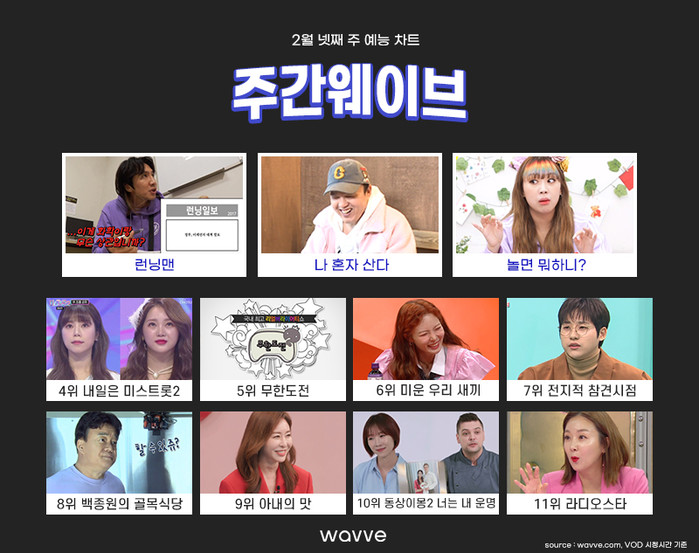 한편 2월 넷째 주 주간웨이브 예능 차트는 ‘런닝맨’, ‘나 혼자 산다’, ‘놀면 뭐하니?’ 등 상위권 순위가 그대로 유지됐다. ‘전지적 참견시점’, ‘아내의 맛’이 각각 두 계단씩 뛰어올라 7위와 9위에 랭크됐다.