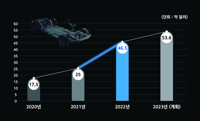 한편 현대모비스의 글로벌 수주는 최근 수 년간 지속적으로 증가하고 있다. 지난 2020년 17억5000만달러, 2021년 25억달러에 이어 지난해에는 46억5000만달러로 2배 가까이 증가한 것으로 집계됐다.