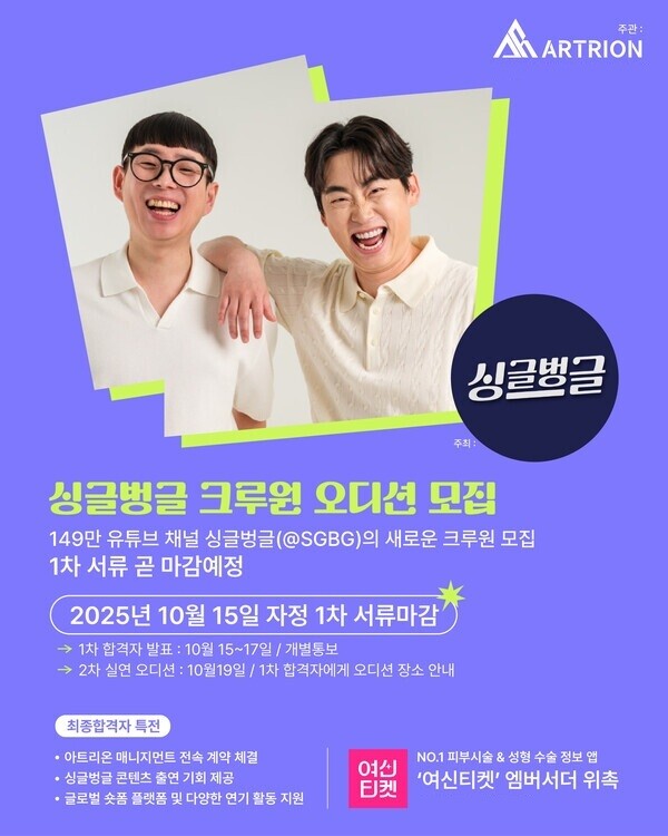 [HBN뉴스 = 정동환 기자] 149만 구독자를 보유한 인기 유튜브 채널 ‘싱글벙글(SGBG)’이 소속사 아트리온(ARTRION)과 함께 진행 중인 ‘싱글벙글 크루원 오디션’의 서류 접수 마감을 15일 자정까지 연장했다고 13일 밝혔다.