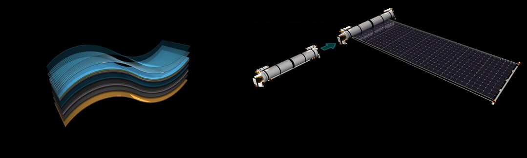 | (왼쪽부터) 한화시스템 사내벤처 플렉셀 스페이스가 개발한 '우주용 탠덤 유연 태양전지' 셀 구조, '우주용 탠덤 유연 태양전지' 판넬이 두루마리처럼 펼쳐지는 전개 모듈 형상 [사진=한화시스템] |