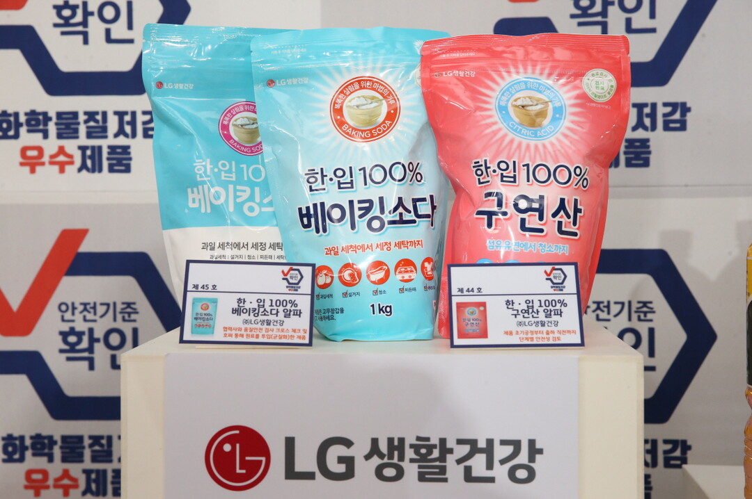 | 화학물질저감 우수제품에 선정된 LG생활건강의 한·입 구연산 알파와 베이킹소다 알파. [사진=LG생활건강] |