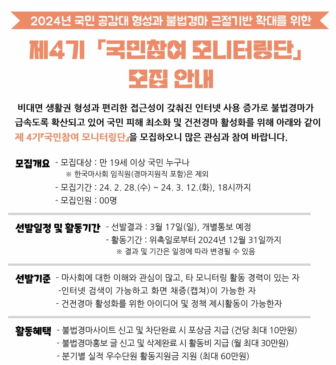 | 한국마사회가 온라인 불법경마 피해 예방 및 확산 방지를 위해 ‘제4기 국민참여 모니터링단’을 모집한다. [사진=한국마사회] |