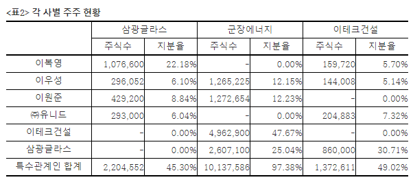 | ▲삼광글라스, 군장에너지, 이테크건설 주주현황 |