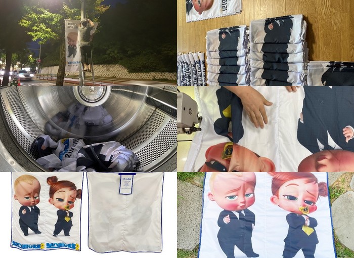 서울 한강 공원 등에서 가로등 배너 현수막으로 사용된 <보스 베이비 2> 플라스틱 재질의 현수막이 캐릭터 피크닉 매트로 전격 변신했다. 이번에 광고 현수막 철거 및 분류, 세탁, 제작 등을 통해 완제품으로 이어진 제작과정 이미지까지 공개돼 눈길을 끈다.