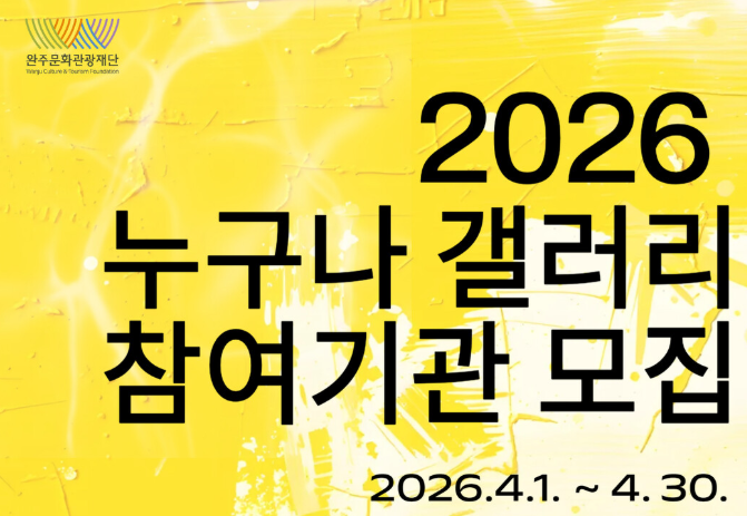 [HBN뉴스 = 이수준 기자] 완주문화관광재단(이사장 유희태)은 관내 소장품을 활용하여 군민들의 일상 생활권 내 전시 활성화를 도모하는 「2026 누구나 갤러리 : 완주 작가 작품 대여‧전시」참여기관을 오는 30일까지 모집한다고 밝혔다.