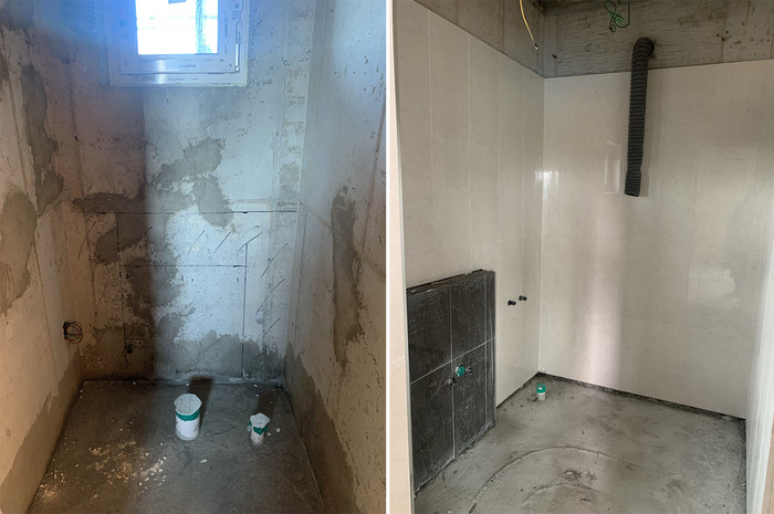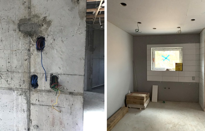 | ▲(좌)콘센트와 스위치의 위치 (우)나무 합판 위에 석고보드 부착. 실내공사가 마무리되었기 때문에 전기공사를 변경하는 것이 매우 어렵다. |