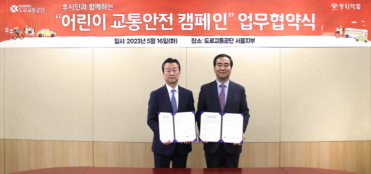 | 유준하 동화약품 사장(왼쪽)이 도로교통공단과 업무협약을 체결하고 기념사진을 찍고 있다. [사진=동화약품] |