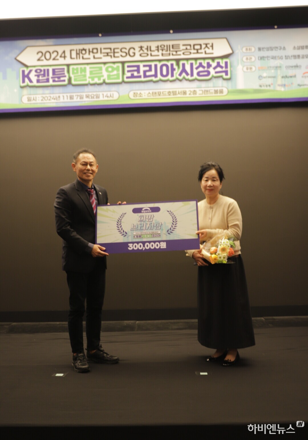| 7일 오후 2시 서울 상암 스탠포드호텔에서 열린 ‘제1회 2024 대한민국 ESG 청년웹툰 공모전’ 시상식에서 진세근 희망브리지 상임감사(왼쪽)와 전태경 대리 수상자가 기념촬영을 하고 있다. |